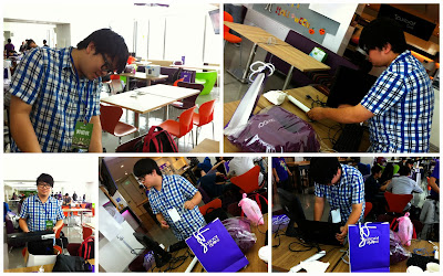 刷信用卡刷到清晨三點才上床睡覺的他,隔天早上九點就跟我在會場集合,開始佈置我們的開發基地,面對接下來不眠不休的 36 小時。但是這時候有沙發的好位置都早已被占光了,我們被迫坐在靠近網路 switcher 設備旁邊的桌椅。