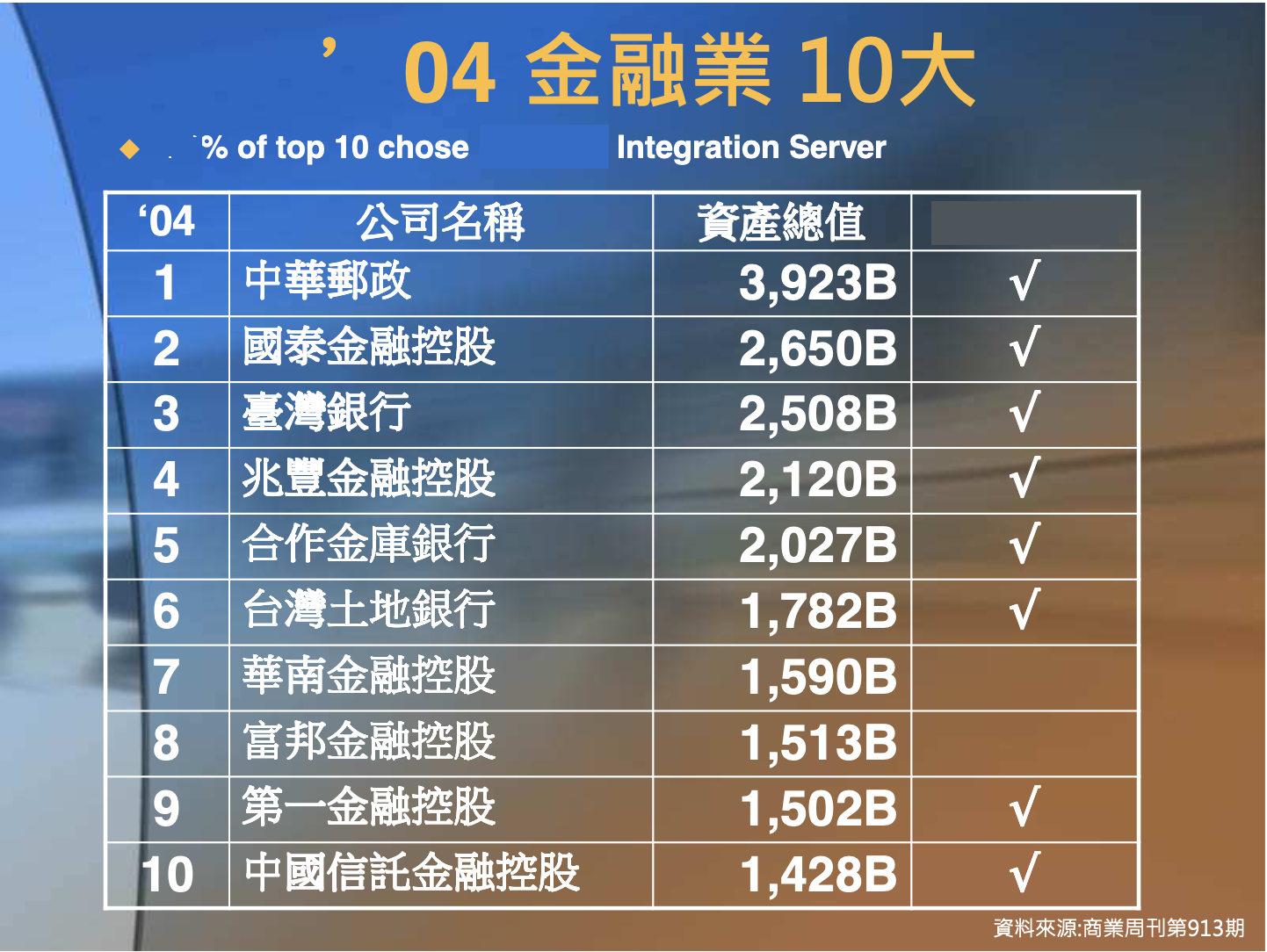 這樣高單價的軟體,絕對不是一般中小企業買得起的價格,所以客戶清一色都是銀行、壽險、金控資本上億等級的大客戶,當時台灣前十大金控,就有八間採用我們產品,市佔率近 80%。